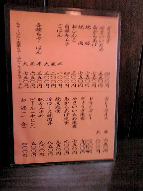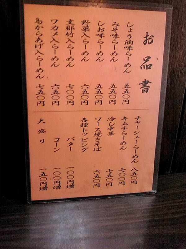 | メニュー | ラーメン(¥390)、みそラーメン・塩ラーメン・わかめラーメン・メンマラーメン(¥550)、チャーシューメン(¥720)、肉野菜ラーメン(¥780)、チャーハン(¥620)、五目チャーハン(¥770)、牛丼(¥560)、カレーライス(¥480)、レバニラ炒め定食(¥920)、その他 | |||||||||