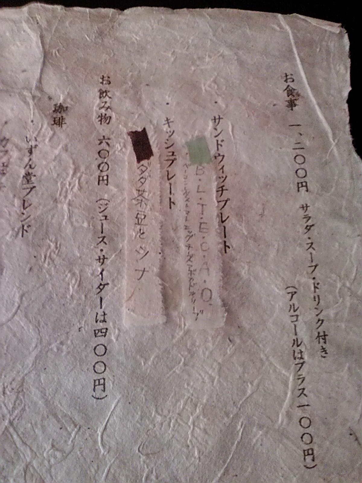 | メニュー | ラーメン(¥400)、ワンタンメン(¥550)、タンメン(¥600)、チャーシュメン(¥750)、チャーハン(¥600)、餃子(¥400)、中華丼(¥700)、カレーライス(¥450)、五目カタやき(¥700)、レバニラ炒め(¥700)、肉野菜炒め(¥800)、その他 | |||||