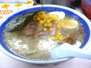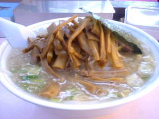 | 一言 | 村山ホープ軒の3軒となりにあります。ホープ軒で食べた後「こんな近くにラーメン屋さんがあるんだ」と発見したので翌日さっそく行ってみました。頼んだのは「支那そば」で理由は一番安かったから。ところが結構期待以上のものが食べられました。魚出汁系の醤油ラーメンでタマネギのみじん切りが浮いています。タマネギが入ると甘ったるい味になりそうですがそんなこともなく美味しかったですよ。店にはいると豚骨スープの香りが充満しています。一番の売り物は豚骨系ラーメンなんですね。今度いつか食べてみます。 11/29 熊本豚骨ラーメン+味玉(画像右)を食べました。とっても濃厚なスープでカロリー高そうです。麺はストレートの細麺、本格九州味でなかなかいけます。 「ラーメンのカロリー表」 2004/2/21 1月にご主人が亡くなったそうで残念ながら閉店しました。 |